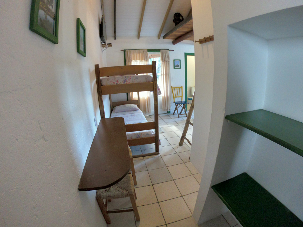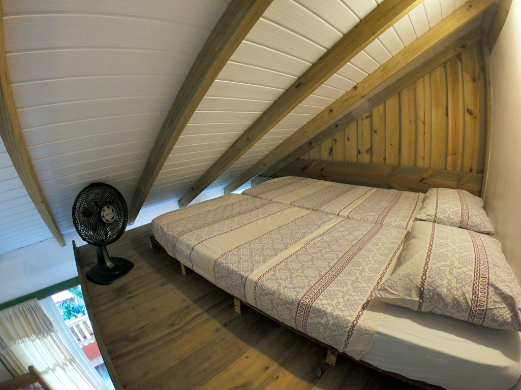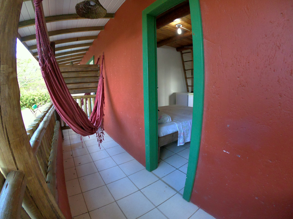 Suíte Nature G para até 6 pessoas no andar superior, possui uma cama de casal, uma beliche e um mezanino com 2 camas de solteiro acessivel por escada, Tv LED 32, mesinha com banquetas, frigobar, duas varandas sendo uma com rede, Wi-Fi, vista da piscina e parcial da lagoa.
