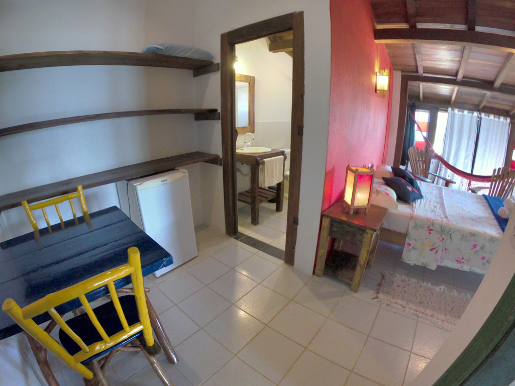 Suíte Master para 3 pessoas no andar superior, possui uma cama de casal e um sofá/cama de solteiro, Tv LED 40 Smart, frigobar, varanda com rede, mesa com cadeiras, Wi-Fi e vista da rua lateral.