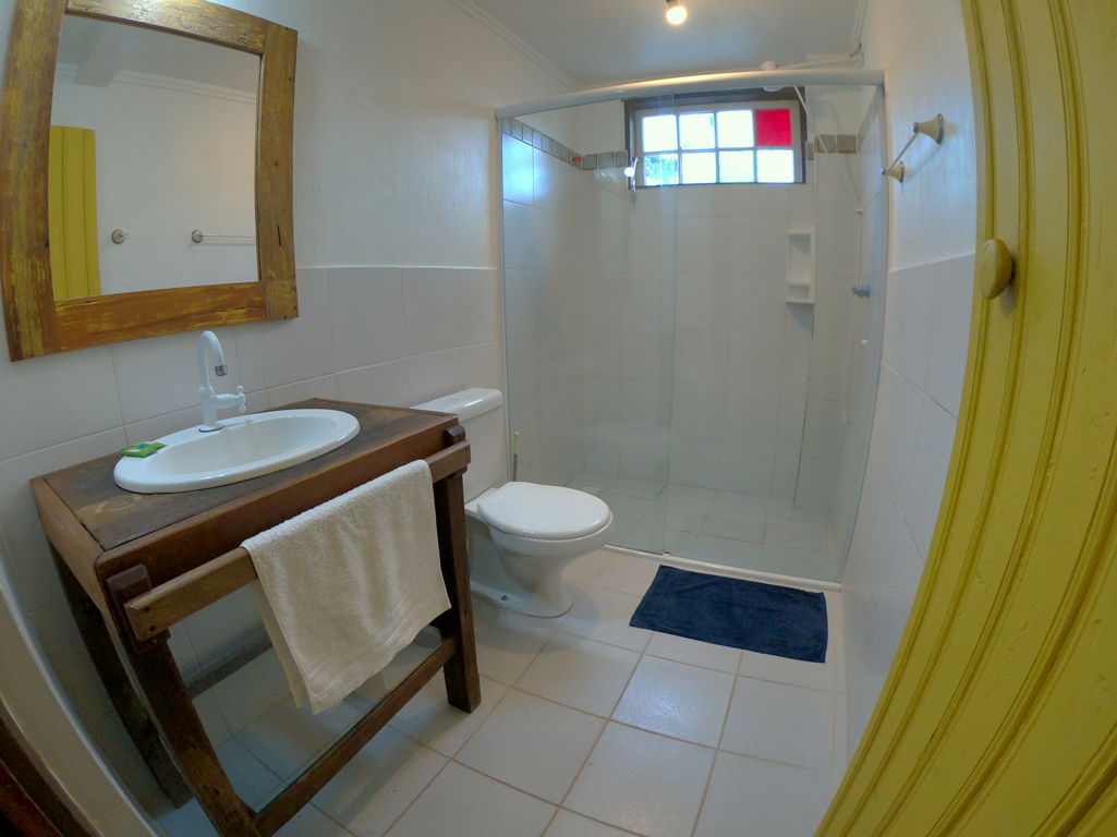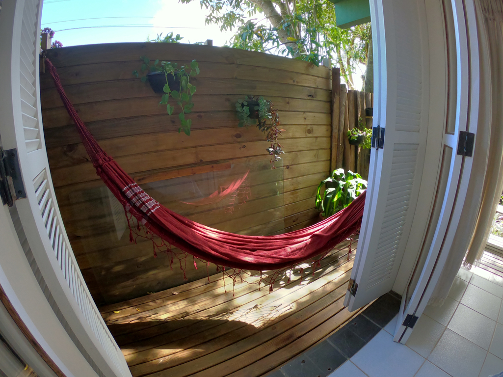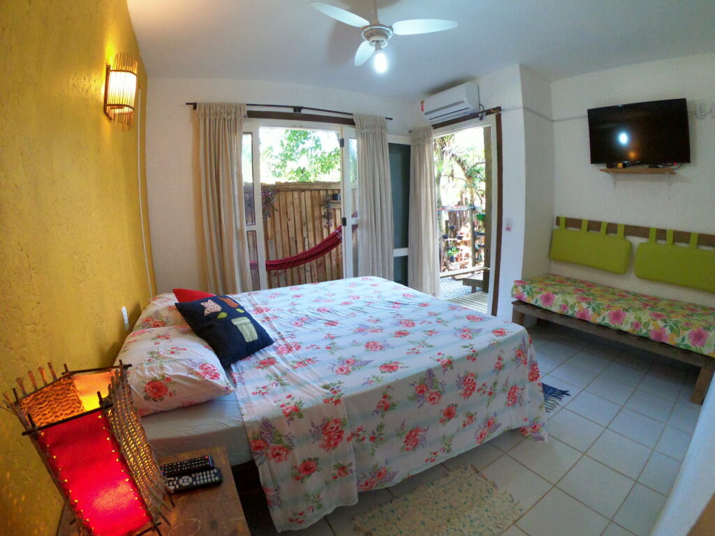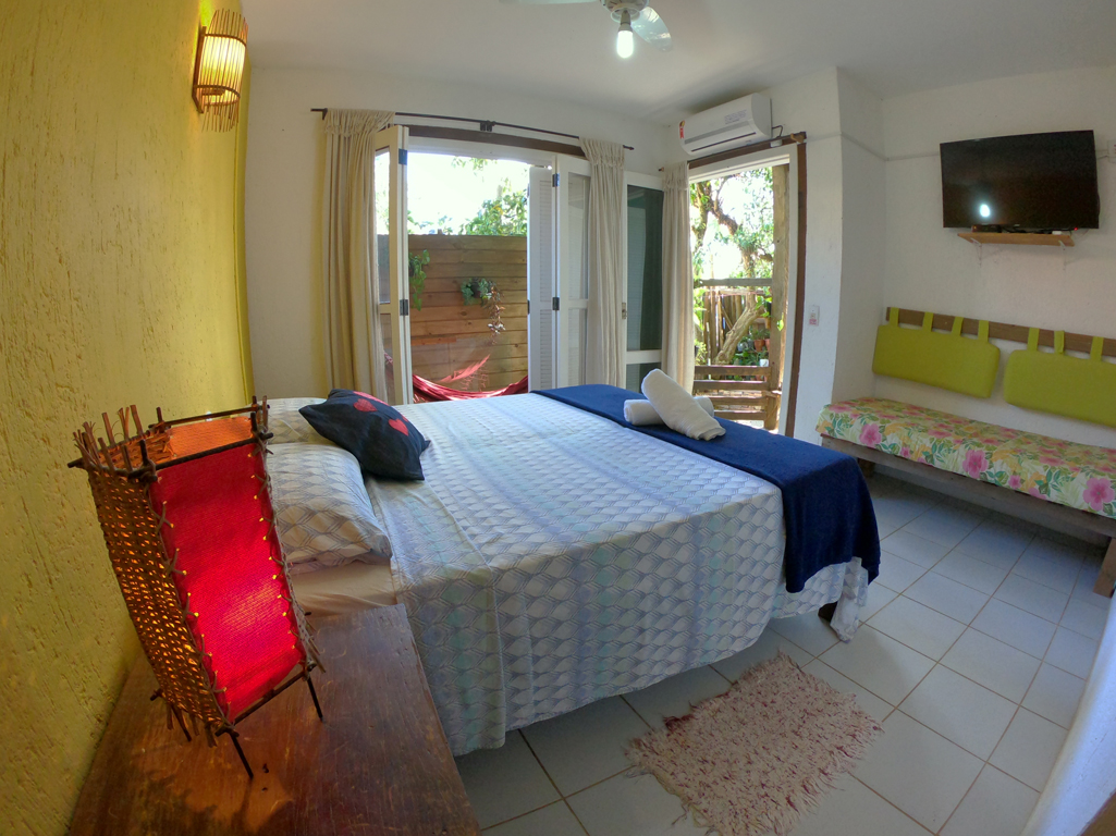 Suíte Master para 3 pessoas no andar térreo, possui uma cama de casal e um sofá/cama de solteiro, ar condicionado, Tv LED 40 Smart, frigobar, varanda com rede, mesa com cadeiras, Wi-Fi e pequena vista do jardim.