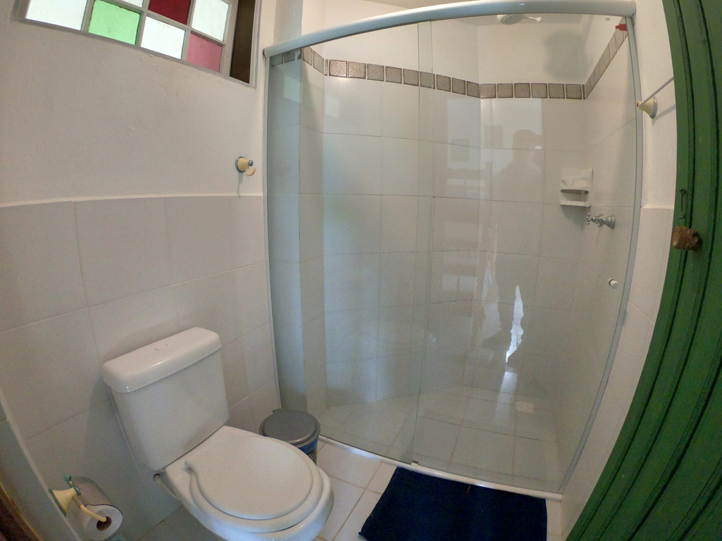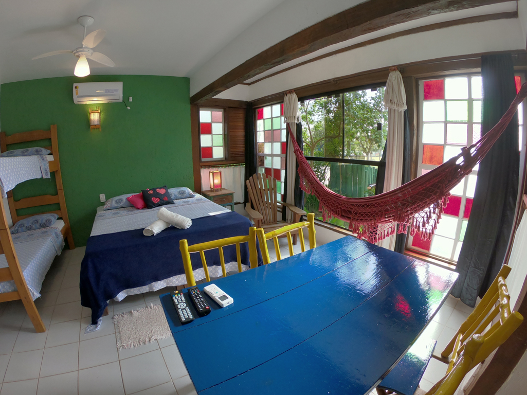 Suíte Master para até 6 pessoas no andar térreo, possui uma cama de casal e duas beliches, Tv LED 40 Smart, frigobar, rede no quarto, mesa com cadeiras, Wi-Fi e vista fantástica da lagoa, piscina e jardim.